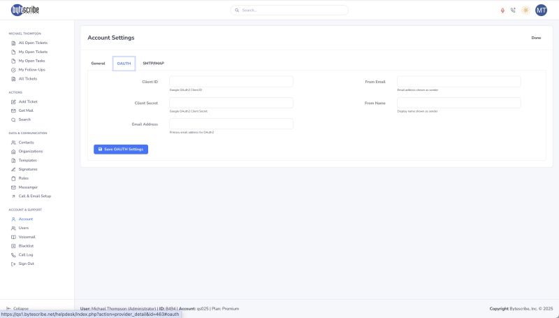 For teams that use Google or Microsoft email systems, Desque supports secure authentication through OAuth 2.0. The OAuth tab allows you to configure credentials by entering a Client ID, Client Secret, and associated email address. You can also specify the sender information, including the “From Email” and “From Name,” that customers will see when receiving messages. OAuth provides a more secure alternative to basic username/password authentication, since it relies on token-based access instead of storing sensitive credentials directly. This approach is recommended for organizations that prioritize security and compliance with modern email providers.