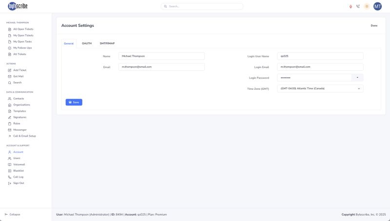 The General tab provides the most essential account-level fields. Here, you can update your name, primary email address, login username, and time zone. Administrators also have the option to adjust login credentials, including resetting passwords or changing the email associated with the account. Keeping this information current ensures that agents can log in reliably and that outgoing notifications are associated with the correct identity. The time zone setting is especially important, as it affects how tickets, call logs, and reports are timestamped. Ensuring accuracy here guarantees consistency across global teams and avoids confusion in customer interactions.