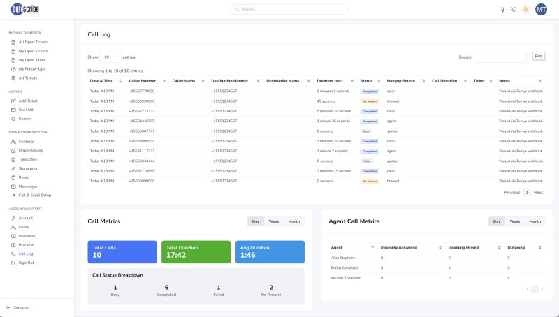 The Call Log is more than just a record—it is directly tied into ticketing workflows. Many calls automatically generate or link to support tickets, ensuring that each customer conversation is documented for future reference. Notes associated with each call provide additional context, such as integration details from the telephony system. By linking calls with tickets, your team can see the full history of a customer’s interactions, whether they began with a phone call, email, or chat. This unified view helps agents provide consistent support and ensures that no detail is lost between communication channels.
